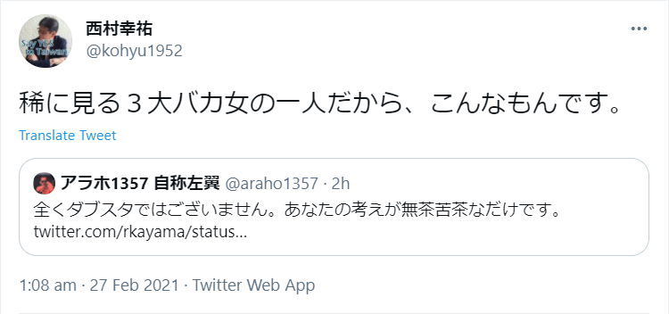 ご近所のネトウヨさん とことん性差別主義者で下劣なジャーナリスト西村幸祐が「岐阜女子大学」の客員教授だという悪寒、大丈夫か #岐阜女子大学 日本軍は敗戦とともに多くの文書を焼却させたが、それでも史料と多くの証言が残っている。 しかし — 西村幸祐 (@kohyu1952) 代わりに上院で大統領選の不正問題を審議するという。 今までバイデンへの政権以降に肯定的だった共和党上院院内総務のマッコーネルが不正投票の審議を上院でするというのだから事態は急展開だ。今号の「3.ヘイト街宣・デモ警報やツイッター情報」と併せてご覧いただき、拡散、ご参加いただければと思います。 そして6月13日(水)時より、no hate tv 第41回は「西村幸祐が公選法違反の疑い?」を放送します。 与党候補の勝利に終わった新潟県知事選挙では、野党候補に対する大規模な